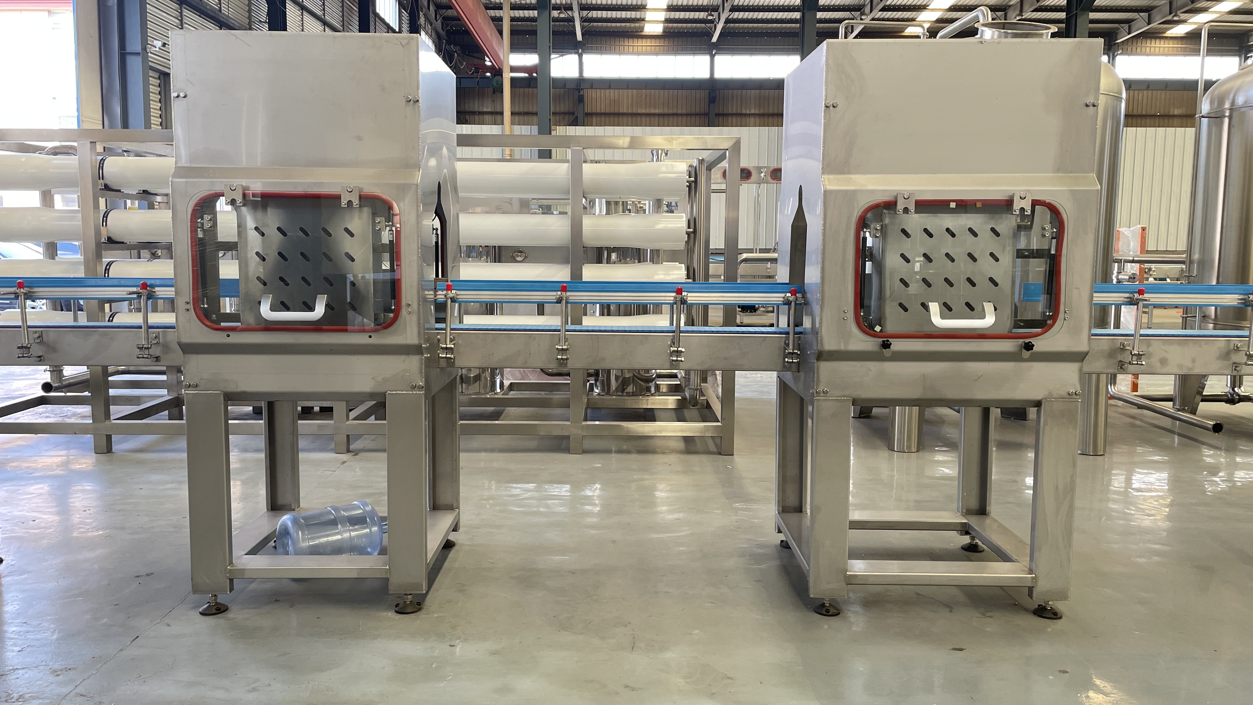 工作步驟:自動(dòng)拔蓋-自動(dòng)外刷桶-自動(dòng)上桶-藥洗-原水內(nèi)外洗-純水內(nèi)洗-灌裝-自動(dòng)理蓋-壓蓋-自動(dòng)傳送帶傳出-燈檢-熱縮-成品